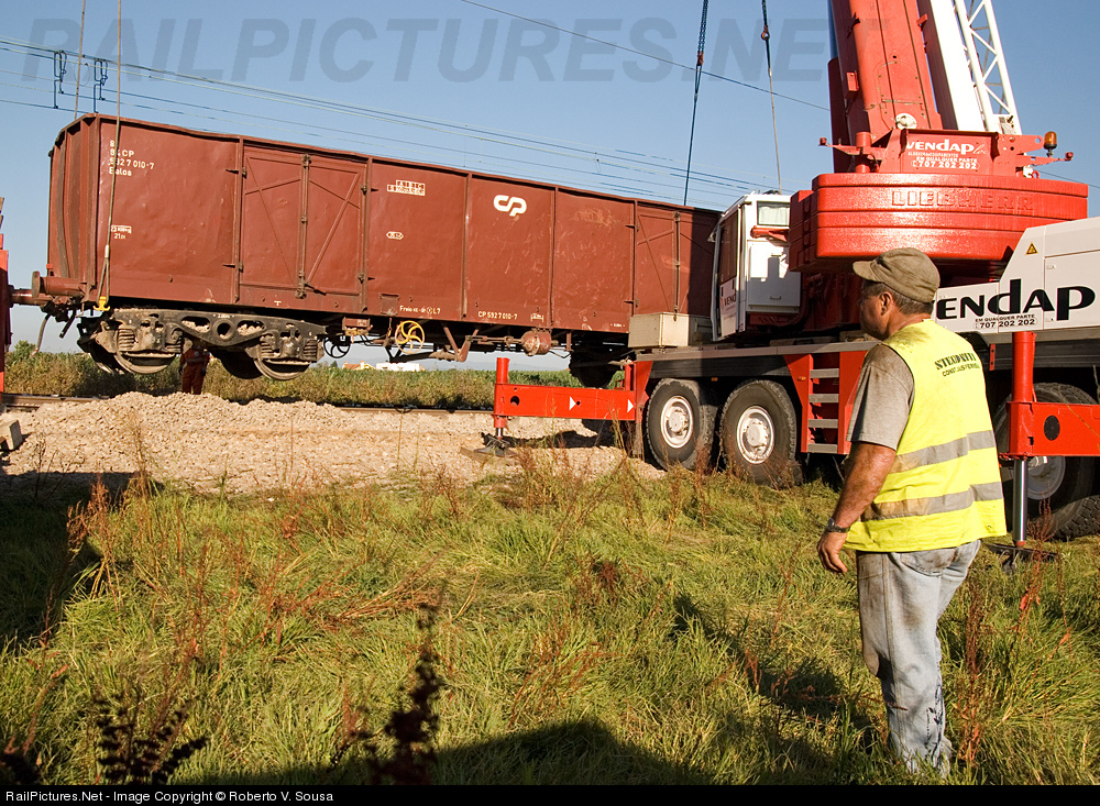 | Crane lifting a train derailed (Freight train Entroncamento-Gaia) in Válega. This operation was to be made by the railway crane, but the operation was finally made by two road cranes. Válega, Aveiro. |