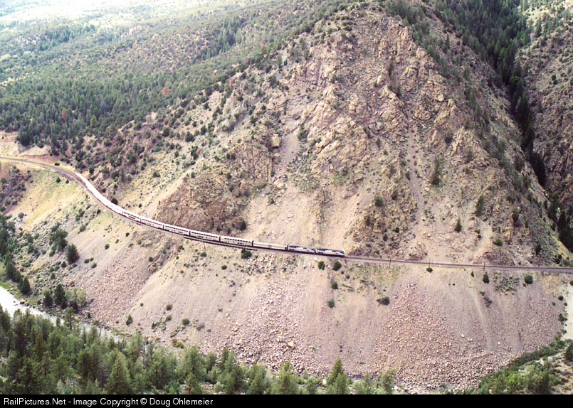 Amtrak's California Zephyr slows along the Colorado River as it enters Little Gore Canyon west of Kremmling, Colo. On the Union Pacific - fomer DRGW- Railroad. Shot from high atop Inspiration Point off of Trough Rd., southwest of Kremmling. 35MM-80MM lens