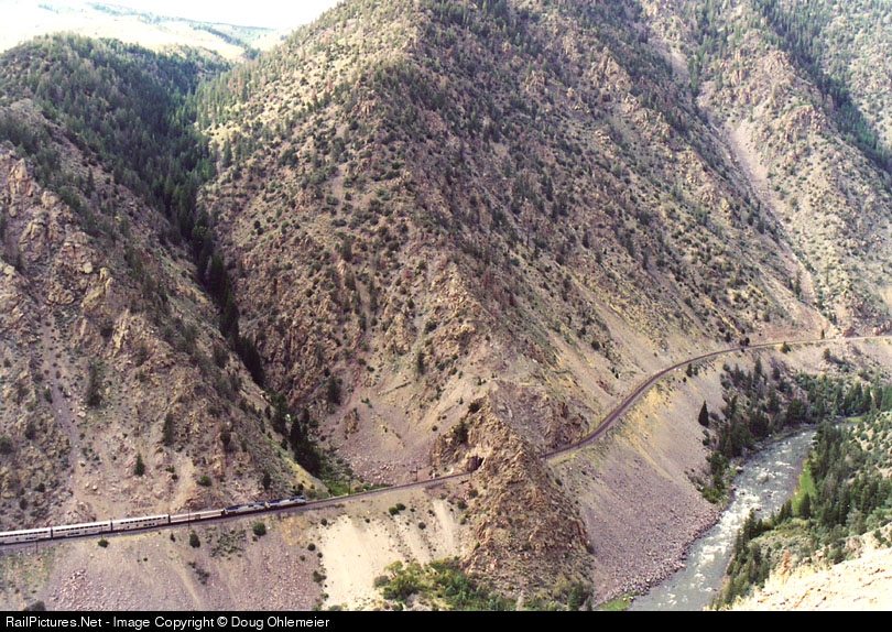 The California Zephyr along the Colorado River in Little Gore Canyon. Shot from high atop Inspiration Point off of Trough Rd., southwest of Kremmling, Colo.