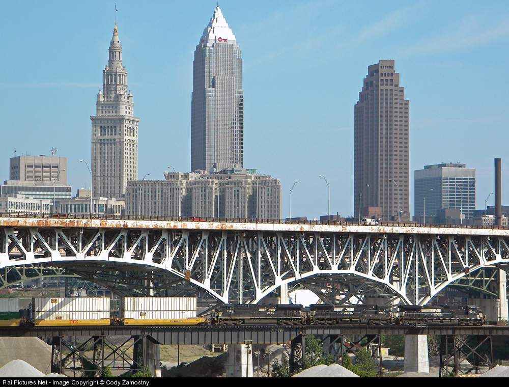 | After a short wait at the drawbridge, intermodal train 206 hustles across the NKP viaduct over the flats. Towering above the train are a few of the tallest structures in Cleveland, including the Terminal Tower (left) and the Key Bank building (center). |