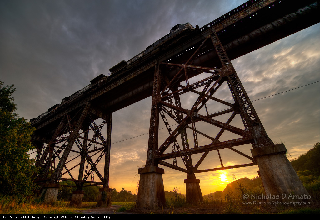 Northbound pig train 204 rolls across the Staunton River Trestle in the heavy humid air of a summer sunset after a line of storms soaked the region.