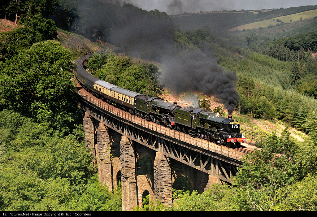 | The Cornish Rivera one of the most famous Great Western Railway's named expresses, was rerun to celebrate the 175 anniversary of the GWR. Seen here crossing Largin Viaduct in Cornwall originally designed by Isambard Kingdom Brunel, a view that has not been possible for over 25 years as the slopes of the hillside were covered in trees and had to be felled as they were suffering from a disease. The lead loco is Castle Class 5029 Nunney Castle the second loco is King Class 6029 King Edward I. |