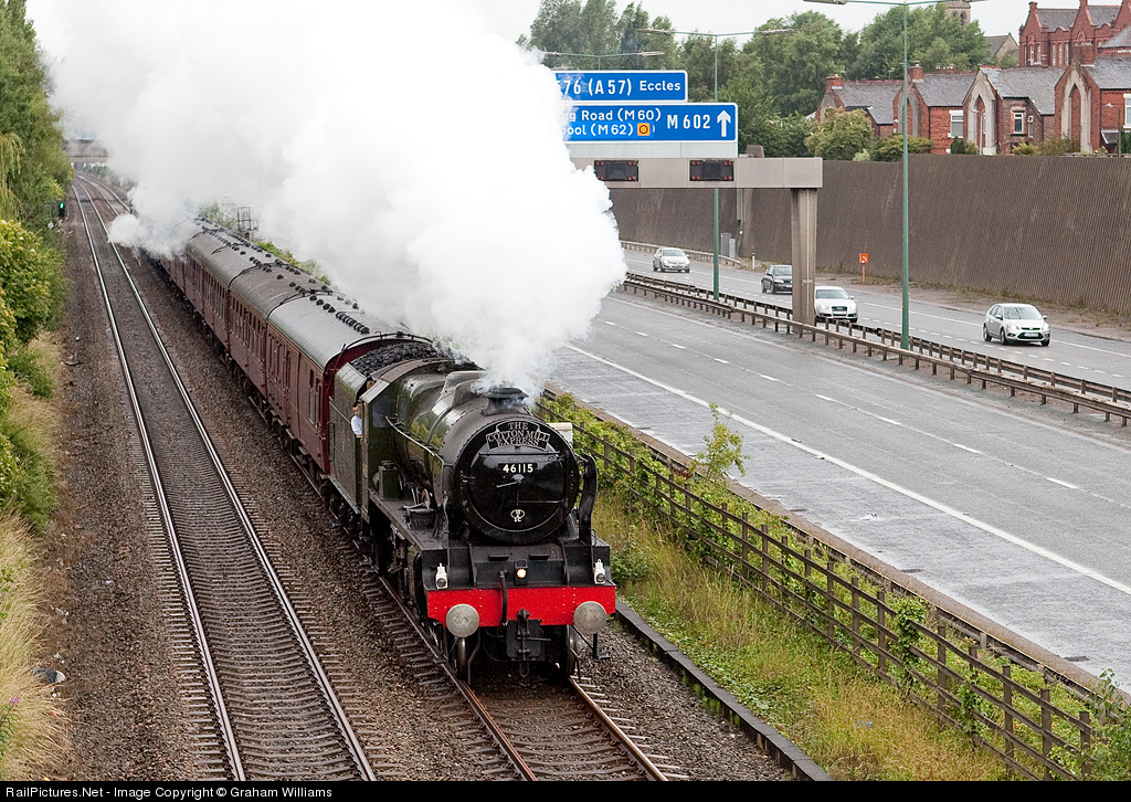 | Royal Scot Class 46115 Scots Guardsman runs alongside the M602 Motorway as it screams away from Eccles with the Cotton Mill Express on a very wet July morning. I imagine the drivers of the vehicles on the motorway got quite a surprise seeing a steam train. |