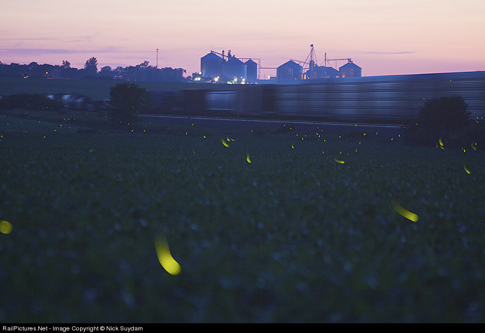 At dusk on a warm summer evening, lightning bugs, or fire flies, begin to rise from an Illinois corn field as a Union Pacific freight train rolls by in the distance.