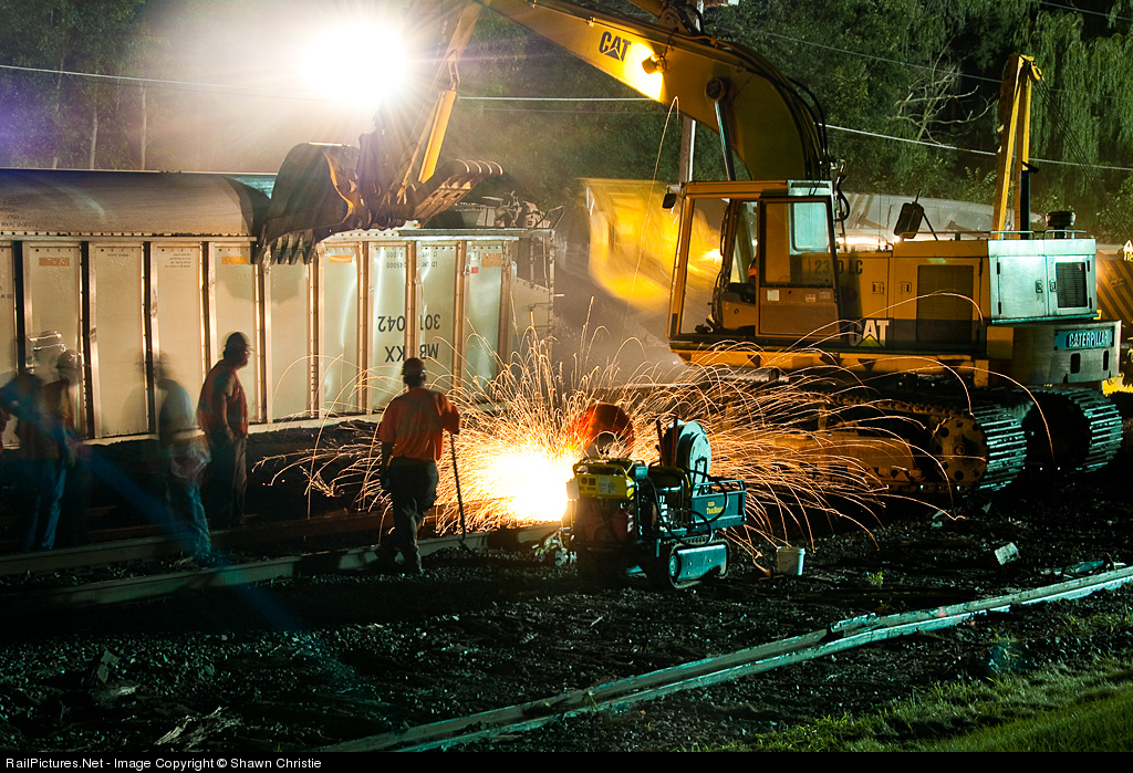 While one crew works on cutting off the twisted rail, a backhoe moves one of the derailed coal cars off of the tracks. While having a derailment in the middle of a populated location could have been really bad, it made it really easy to see the cleanup action up close.