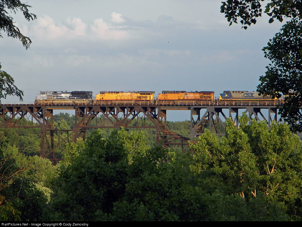 | The MoPac Heritage unit makes its first journey over CSX's Marcy Trestle on the point of eastbound ethanol train K648. This one-of-a-kind engine is leading quite a powerhouse, consisting of two more UP's and a pair of CSX's. |