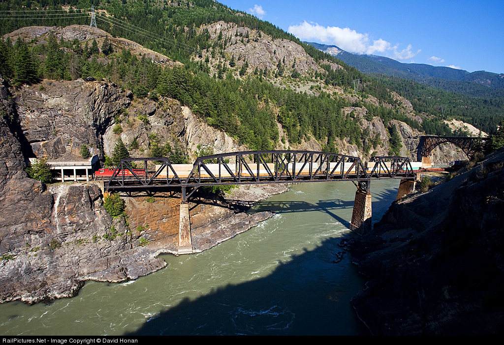 A visit to British Columbia's Fraser and Thompson River Canyons guarantees one thing: A never-ending series of engineered solutions to overcome the challenges of constructing two water-level railroads through the narrow, steep canyons that the rivers cut through the Cascade Range. Located at Cisco is one of the classic examples these solutions, where CP (the first line to follow this route) punched a tunnel through an outcrop and then immediately jumped across to the Fraser River to its east bank. Arriving some two and a half decades later, CN predecessor Canadian Northern Railway was left with little choice but to also switch sides of the Fraser, which it accomplished via the steel arch bridge at right. Popping out of the aforementioned tunnel on this glorious summer morning is the trailing remote of a long eastbound CP stack train, taking advantage of the river-grade line and modern technology to move nearly two miles of containers with only three locomotives in a 1x1x1 DPU configuration.