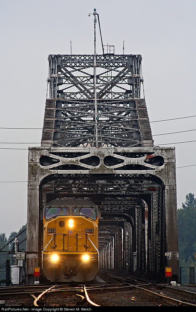 | A SD9043MAC has just entered the beautiful state of Washington, while the rest of its grain train is still on the draw bridge over the Columbia River, and in the state of Oregon. |