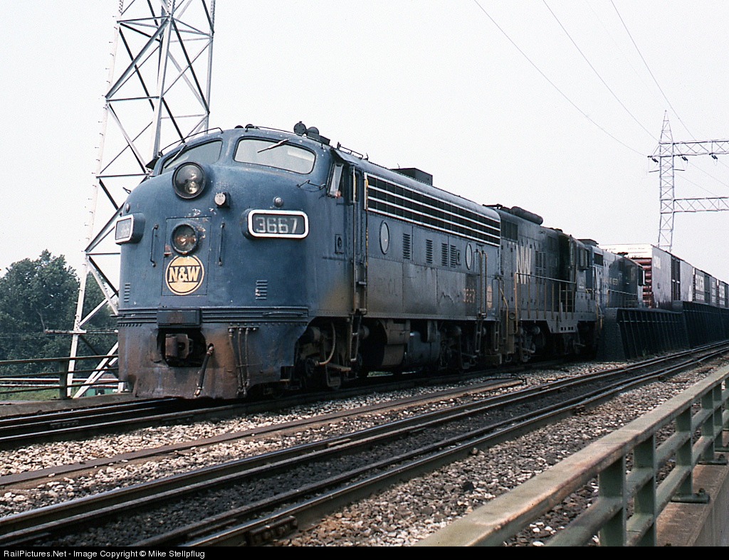 A N&W F7A leads a pair of geeps with a train from Canada as it heads to Bison Yard. The train is on the bridge that used to go across the West end of Frontier yard.