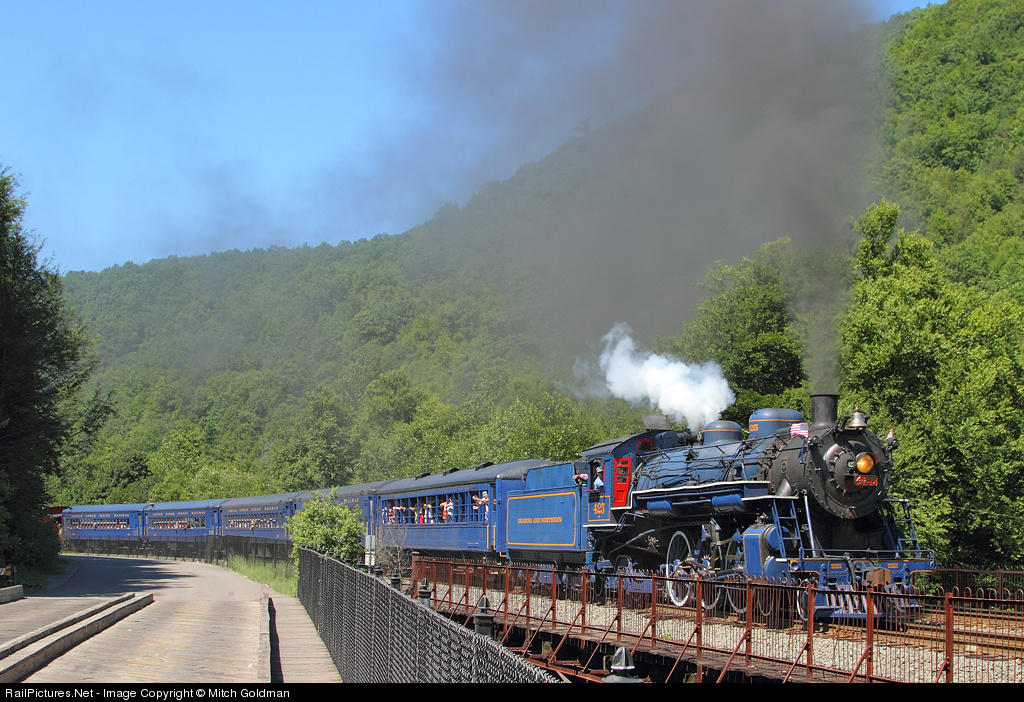 | R&N #425, in a CNJ-like Blue Comet livery now complete with matching blue consist, travels over former Lehigh line trackage. To the left, is the old 1912 CNJ alignment which was built to bypass the Turn Hole Tunnel and now used to access the Lehigh Gorge State Park. See this location from the other side in a photo by Nick McLean. |