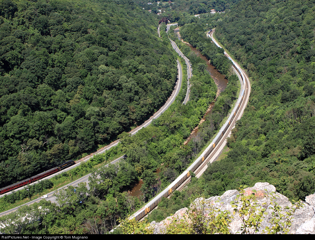 | WMSR 502 works its way west thru the Cumberland Narrows as is a westbound autorack on CSX. Had the scenic been out of the station about 30 seconds sooner this would have made for a somewhat better photo opp looking more like a race of 2 westbounds on 2 seperate railroads |