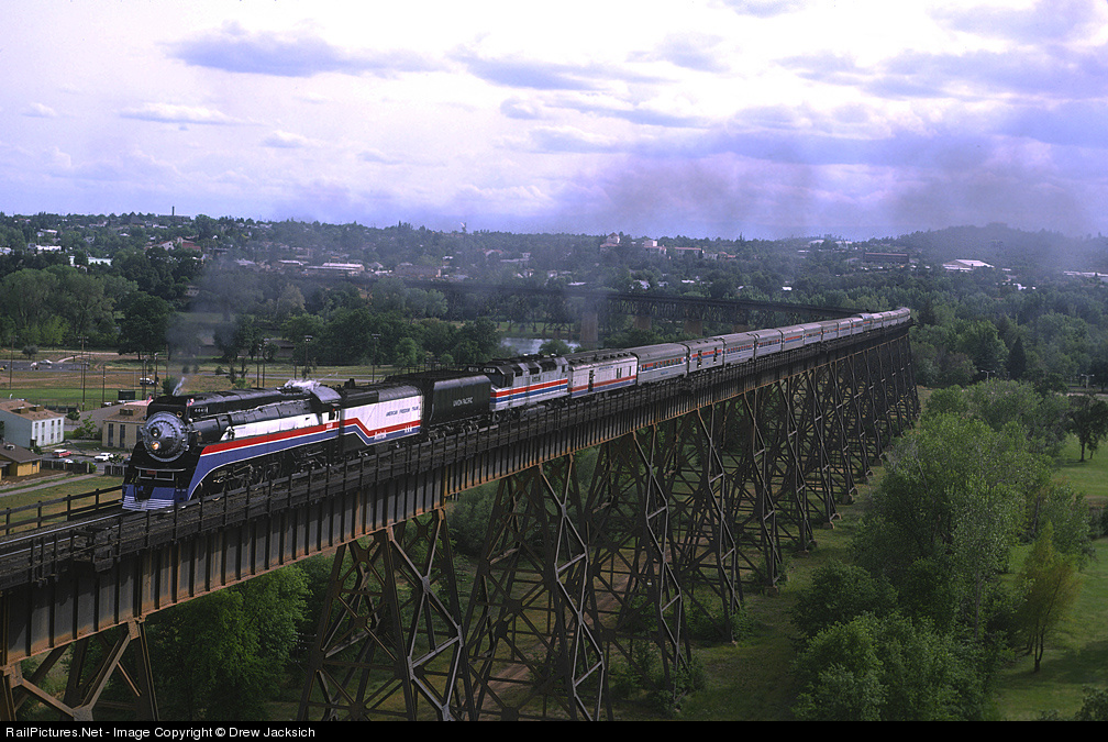 On the way home to Portland, SP 4449 is crossing the large bridge over the Sacramento River in Redding, CA with the Amtrak/4449 cross country excursion. It is Friday, April 29, 1977 and on Sunday, May 1st, 4449 will return home to Portland.