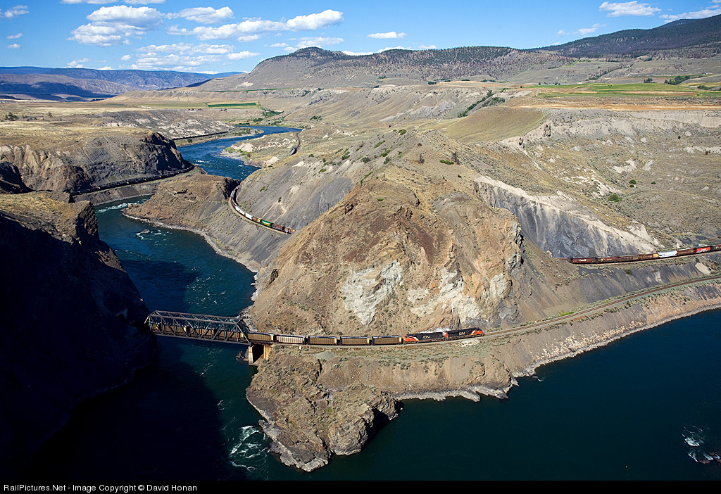 A loaded CN coal train passes an empty CP grain train in the narrow confines of Black Canyon. At this location, the Thompson River twists through an oxbow so tight that the only routing option available to the Canadian Northern Railway, CN's predecessor, was to bore the 1366-foot curved Black Canyon Tunnel through the cliff and then immediately jump across the river. CN 2285 West is strung out through that creative engineering solution while CP 9655 East sweeps through CP's own Black Canyon Tunnel on the Thompson Sub; the wood structure above the fifth car on the CN train is a remnant of the temporary trestle CP used to curl around the point prior to completing its tunnel. The CN and CP "co-production" operation begins just a couple miles west of this location at Coho/Nepa. Photo from private property taken with permission.