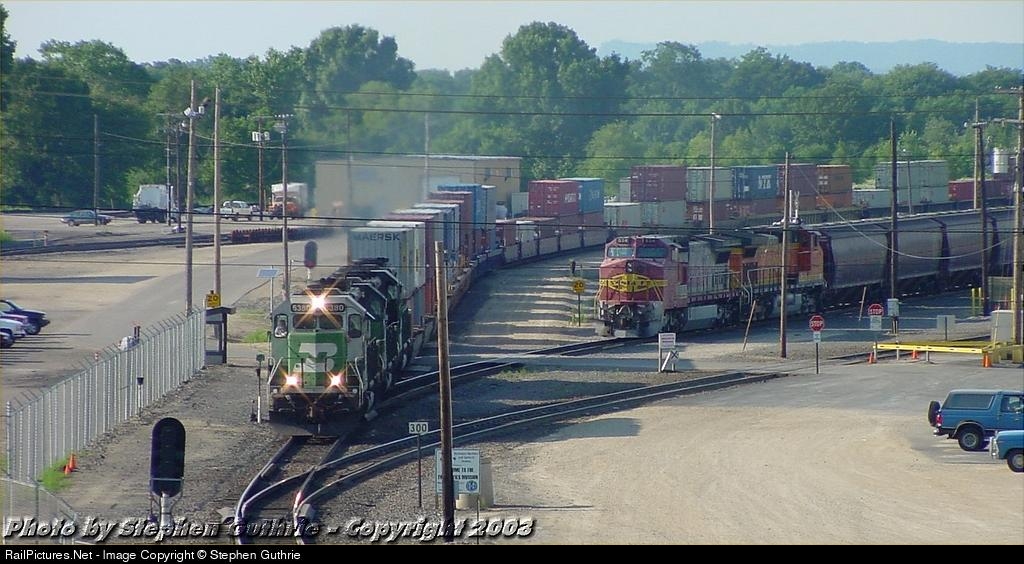 BNSF Stack train pulls ahead of a grain train.