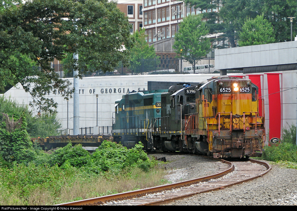 The beast lives! After two plus years out of service the 6525 once again rolls through Athens. Here a northbound Athens Line storage move from Watkinsville passes the massive waste of taxpayer money that is Sanford Stadium on the old CofG. I had shot the power sitting in Watkinsville that morning, and it was by chance that I heard him blowing for a crossing a few miles from my house. By the time I caught up to him this was the first shot I was able to get. Even at 10 mph he beat me through the cluster(expletive deleted) of red lights that is downtown Athens. To top that off CSX let him across the diamond in record time so this was the only shot I got off what was probably the 6525's first time leading a train in several years.