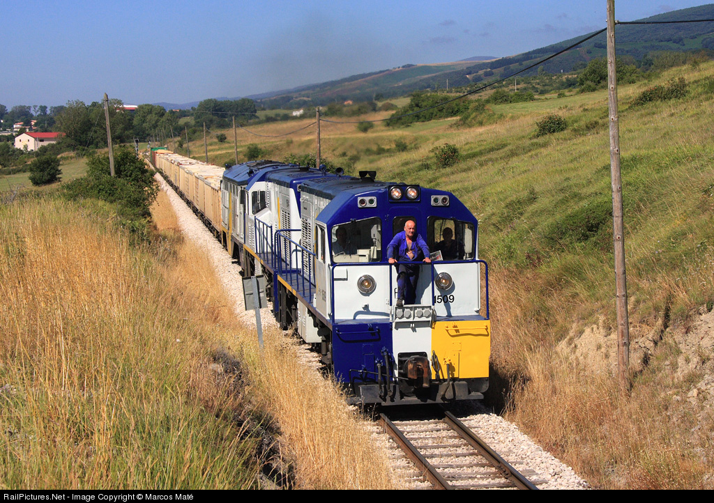 The 1509 and 1504 GECOS tow the Alsthom 1655 and a long sand freight.