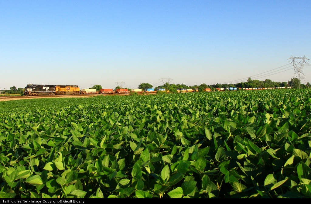 NS 233 rolls by a large field of soybeans, as it heads west on the Columbus District.