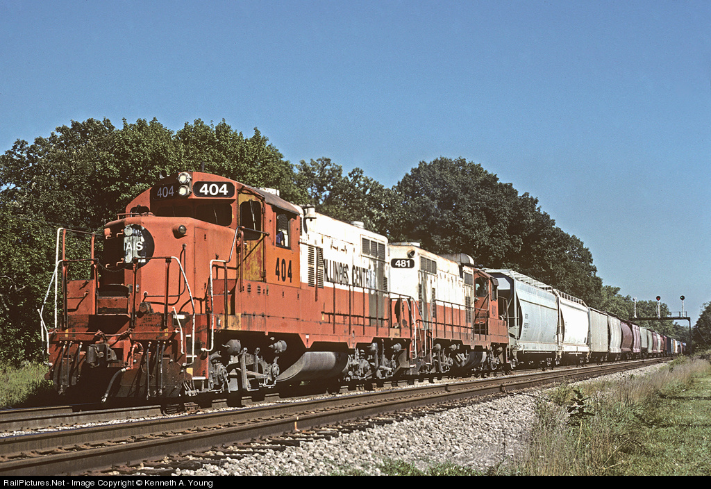 | Iowa Interstate 404 and 481 are leading an afternoon westbound at Joliet, Illinois. The 404 was built as IC GP9 9004, and rebuilt to GP10 8004 in 1968. It was sold to IAIS in October 1984. |