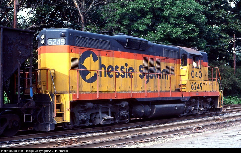 | Chessie System GP interchanges coal hoppers with the Southern, now Norfolk Southern a year ago, in Charlottesville, VA |