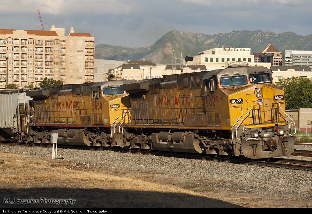 | The wheels of the UP MNPWC-02 wail, as the train slowly makes its way through the curve into a setting sun, with the Salt Lake Tribune building and the Wasatch Mountains in the background. |