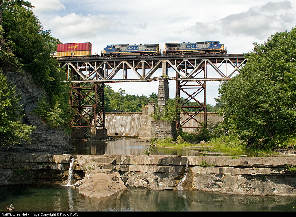 Leaving New York's Capitol District in a hurry, a westbound CSX stack train leaps over the outfall from the Watervliet Reservoir on a warm July morning.