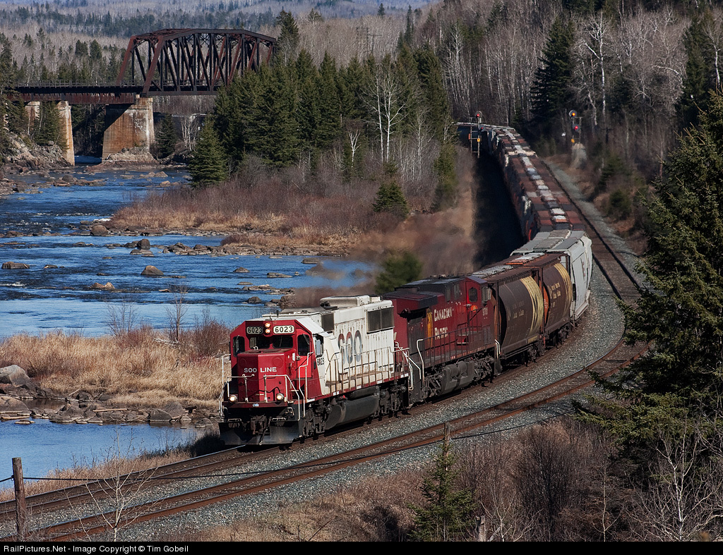 A rare SOO 6023 climbs out of Thunder Bay with grain empties and skirts along the shores of the Matawin River.