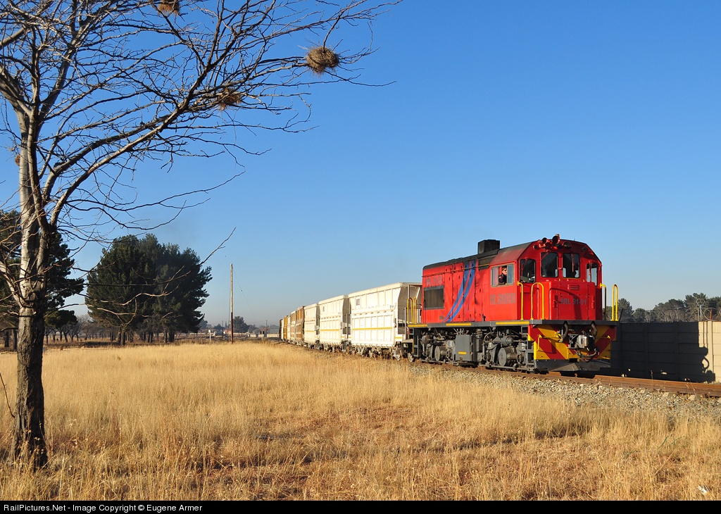Yellow veld grass and clear blue skies are typical of winter in the South African interior. On a cool, sunny morning, RRL Grindrod's ex-SAR/Spoornet/TFR class 91 91-01, works a train of empties to Nyala Shaft. The train has left Transnet tracks and is now running on the branch to the mine. These loco's were built for the 610mm (2'0") gauge and now run on 1067mm (3'6"). The box on the roof is an experimental silencer fitted to the exhaust, to stop complaints from local residents living close to the tracks.