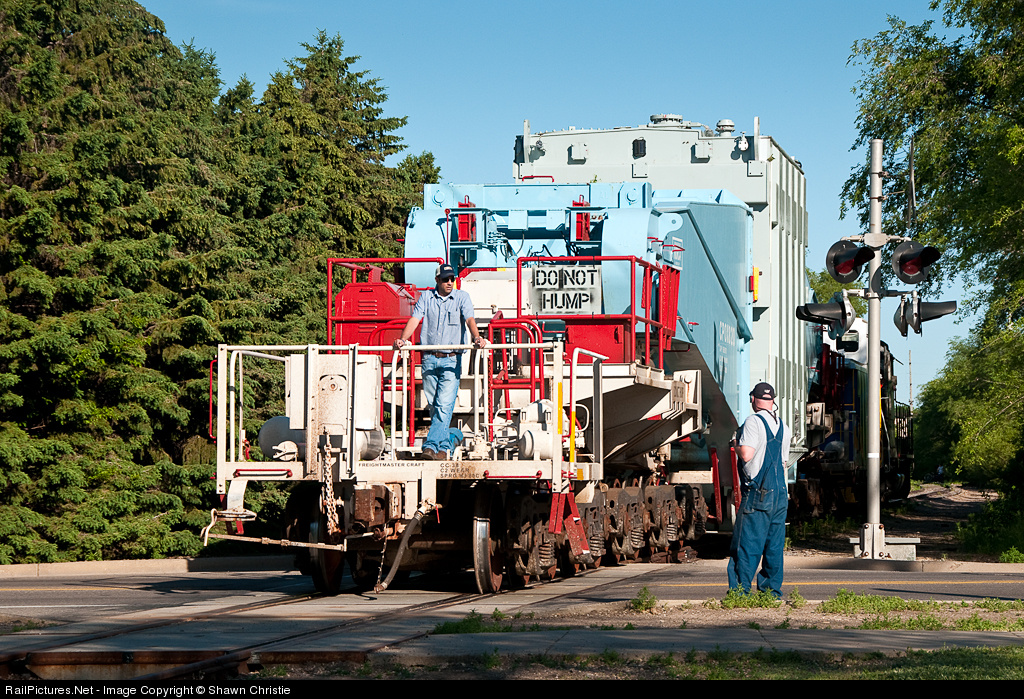 | This is the first train in three years to come down this line. This transformer is for the Excel Energy Monticello Nuclear Generating Plant and is being pushed in for the last couple miles of the trip. This 20 axle schnabel car is owned by Consumers Energy, a Michigan based power company. All the crossings are exempt in Monticello. As you can see the crossing signals no longer work. |