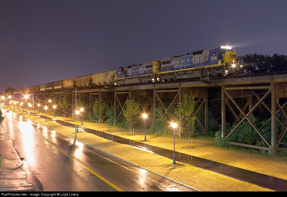 | On a rainy night in Richmond, a loaded grain trains pauses on the James River Viaduct to attach pushers. A 15 second exposure @ f8.0, ISO 200. |