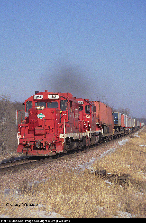 In March 1997 the Illinois Central was running intermodel trains from Chicago, IL, to Council Bluffs, IA, over the old CC&P. Here westbound I-11 blast thru Benson curve east of New Hartford with a pair of red CC units and a decent size train. The train just left Waterloo about 12 miles back.