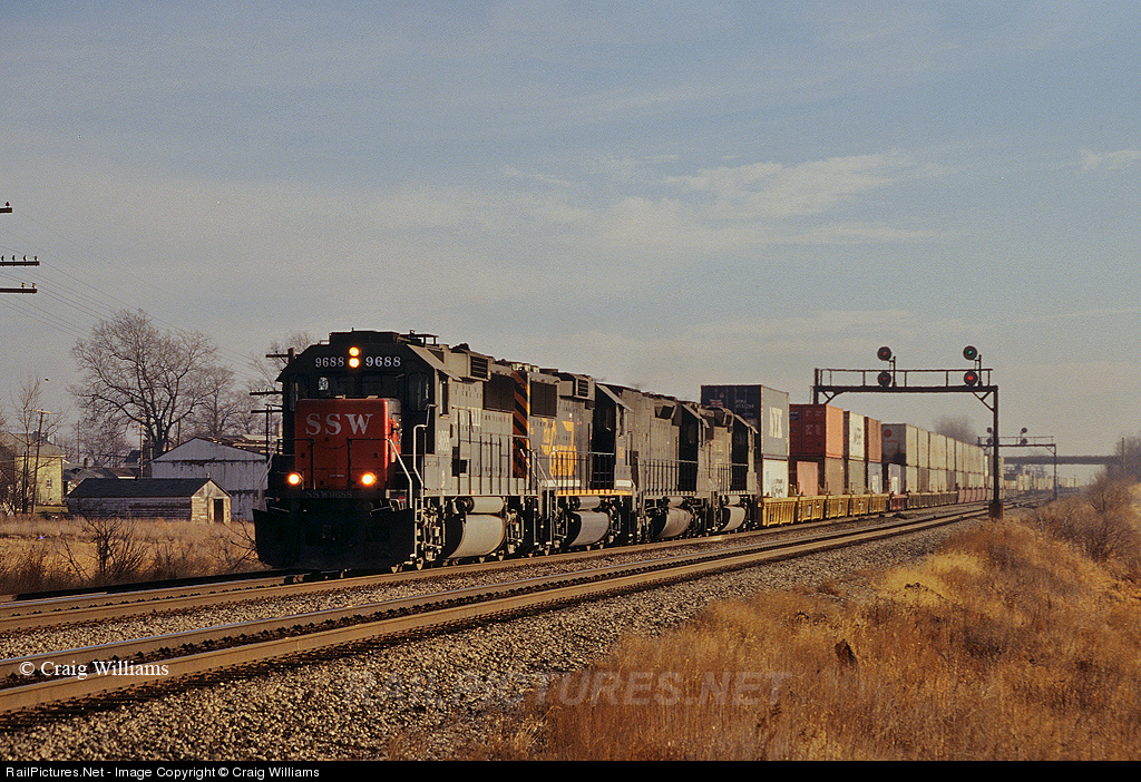 Westbound SP stack train has just top Edelstein Hill west of Chillicothe, IL. SP had trackage rights over the BNSF from Kansas City, MO, to Chicago, IL, via the old Santa Fe. This daily train was from IMX center in Chicago, IL, to City of Industry, CA.