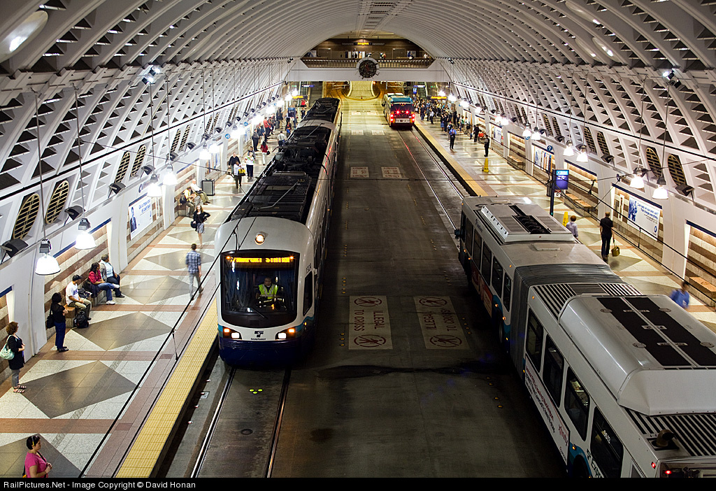 The Downtown Seattle Transit Tunnel, the only place in the world where buses and trains share an underground transit corridor, is a busy place during rush hour, with commuters crowding the platforms to board buses bound for all directions and light rail trains heading south. On this summer afternoon at Pioneer Square Station, an airport-bound Link train takes on passengers at the southbound platform while the northbound platform plays host to buses on King County Metro route 41 and Sound Transit route 550. The buses are scheduled to be relocated to surface streets upon the opening of the University Link extension in late 2016, and the 550 itself is due to be replaced by East Link light rail service in 2020.