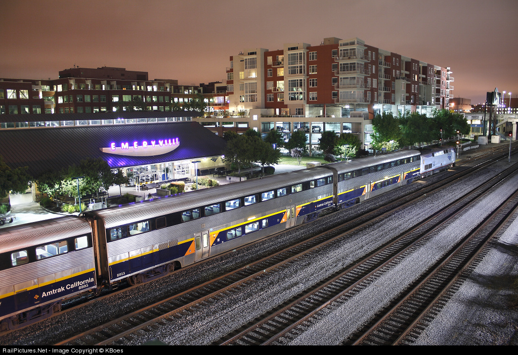 The last time I was in Emeryville was in 1998 while waiting to change from the Zephyr to the Starlight. I tried a couple hand-supported night photos on 35mm slide film. Needless to say, they didn't turn out too well. Twelve years later, I finally made it back with a tripod and a DSLR. My only complaint this time is the #$@# P42 where an F59 should be, leading the last Oakland-bound San Joaquin of the evening.