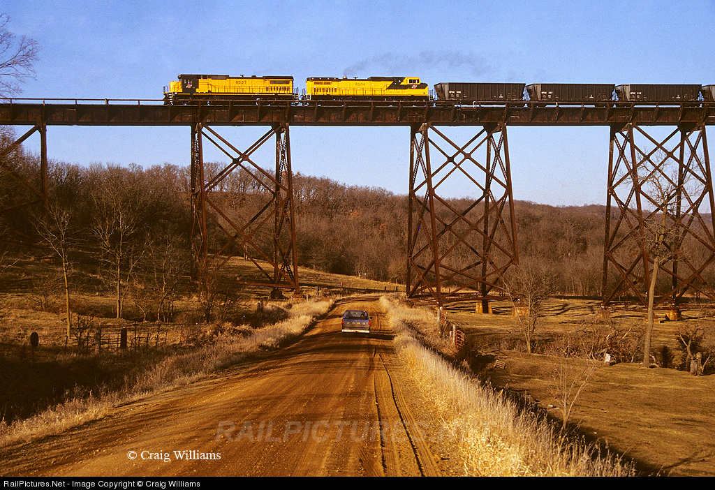 One of the locals stops to watch an empty coal train pass across the Kate Shelly High Bridge, west of Boone. Today's Havana, IL, to Antelope Mine, WY, empty has a brand new Dash 9, 8604 trailing a standard cab Dash 8. UP days were far away still in 1993, but 2 years later these days would become numbered.