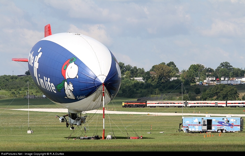 One of the Met Life "Snoopy" blimps was in town for the pro golf tournament. On a visit to the Akron Fulton Muni Airport to photograph the airship I was able to catch the southbound Canton train passing in the distance as Snoopy floated in the morning breeze.