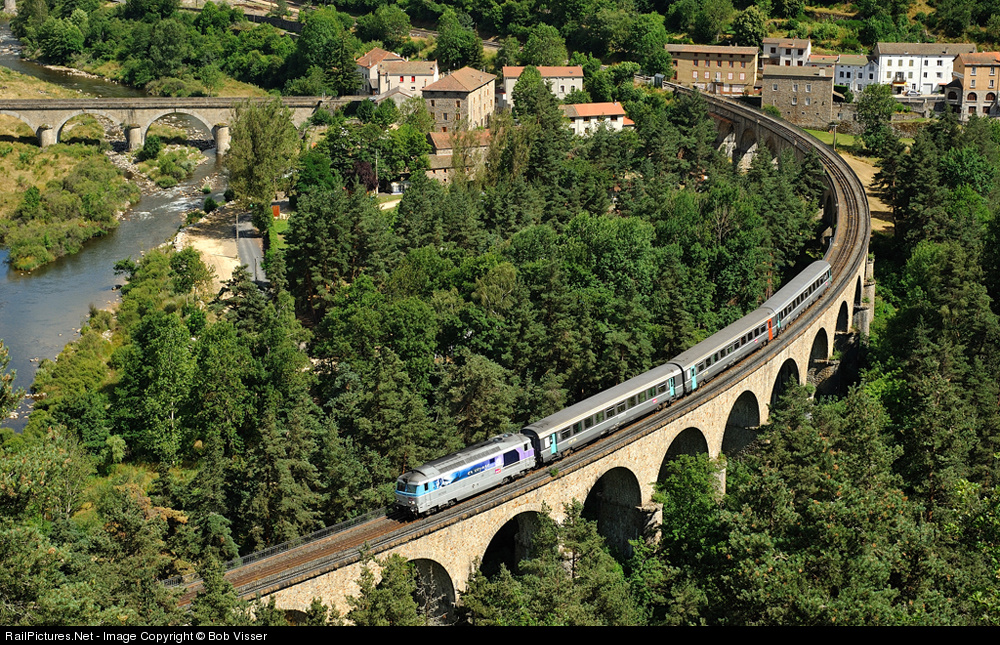 The line through the valley of the Allier has just three trains each day in each direction left. One of them is loco-hauled, the other two are karts. The BB567628 is underway from Marseille to Clermont-Ferrand. Due to the bad condition of the line, speed limit has been reduced to 30 km/h.
