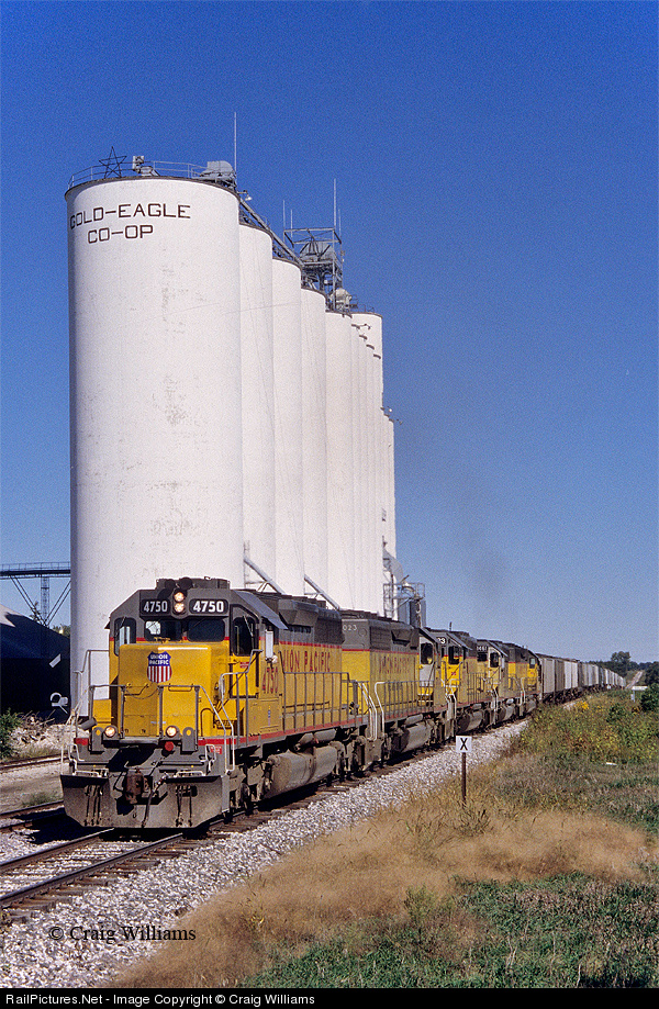 A loaded grain train is only 5 miles from Eagle Grove, IA, as they pull onto the Jewell Sub off the Estherville Sub at Goldfield. This UP 4750, was ex-CN 5005 rebuild by NRE and leased by UP in late 1999. This unit was renumbered to UP 2800 in November 2001, and was retired at the end of lease in April 2002. In this photo the 4750 was to last another month before being renumbered for the next batch of SD70M's.