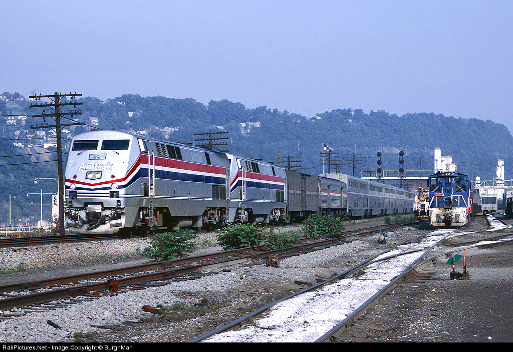 | On a hazy morning in the Mon Valley, Amtrak's eastbound Capitol Limited passes Union RR MP15 #20 as the mill crew switches US Steel's Edgar Thomson Plant. |
