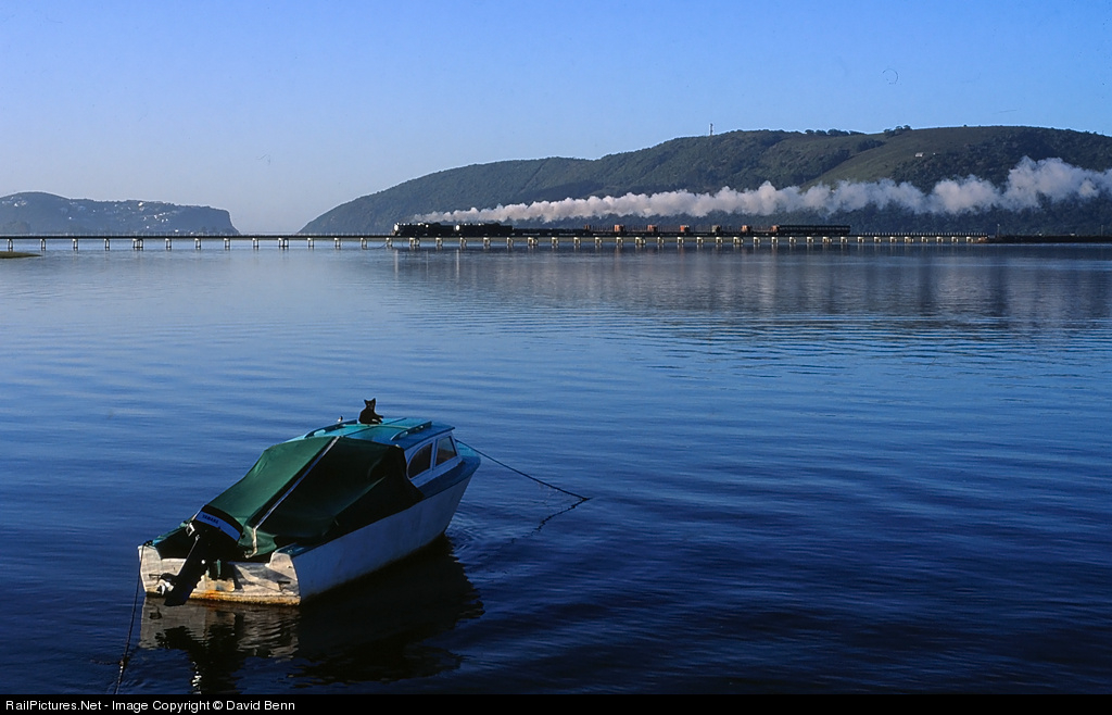 Two Class 24s cross the Knysna Lagoon on the approach to the station. The boat in the foreground was long a feature of the lagoon. The cat is a metal cut-out, meant to frighten birds. It was not very successful. The Knysna Heads are seen in the background. One of my ancestors was the first harbour pilots of Knysna, and would guide the tall ships through the Heads.