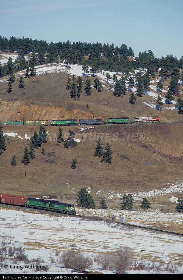 A westbound freight train works hard to climb the nearly 2% grade towards Moffit Tunnel. BN 5075 and 5077 shove hard on the rear of this short freight. The train is about to enter Tunnel #1 near MP 22. BNSF has trackage rights over the UP from Denver west.