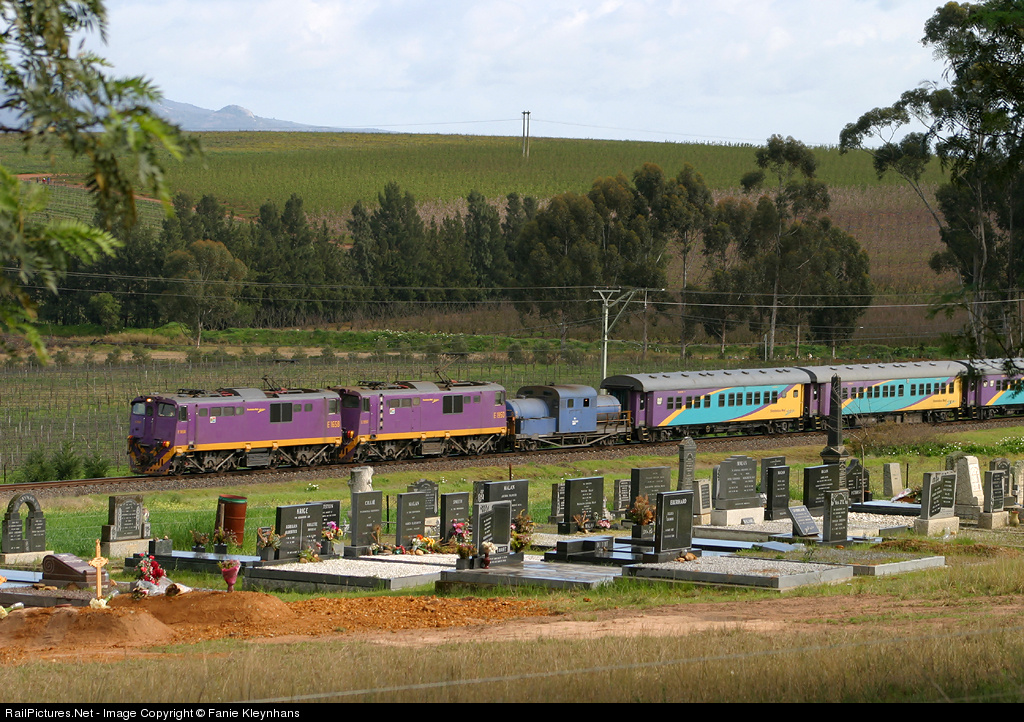 | This is only the second time that I see 2 purple locos working together, here they are leading the Johannesburg to Cape Town Tourist train past a small cemetry a few km from Wellington. |