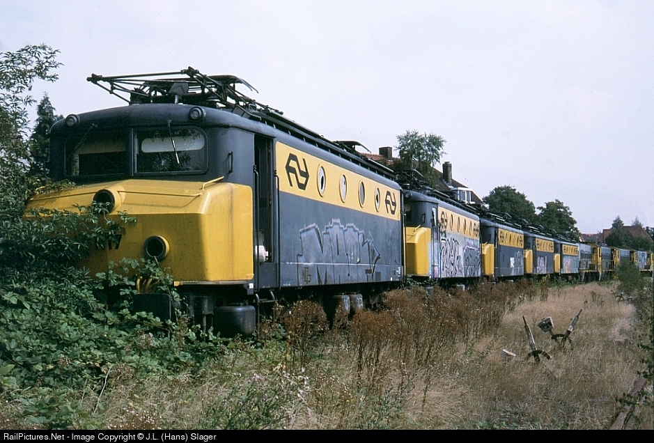 | A row of electric locomotives class 1100 awaiting theis destiny: they were scrapped in 2002 |