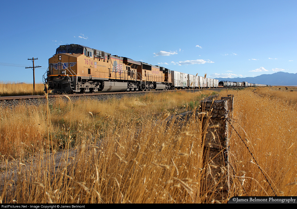 A GE/EMD duo working Union Pacific's North Platte to West Colton manifest shove hard along the former Los Angeles & Salt Lake Route at Lake Point, Utah. This 100 car drag, all 11,740 tons of it was losing considerably momentum as the train ascended Erda hill. The location is at milepost 760, measured from west to east from Los Angeles, in the form of a true western railroad.