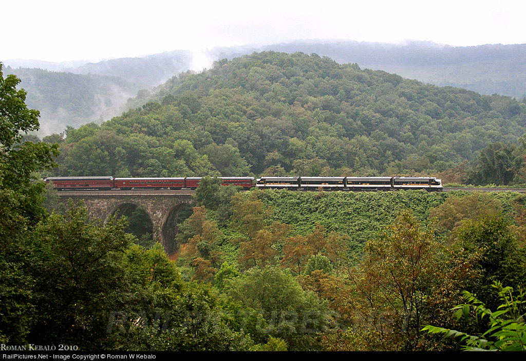 On a misty morning, the NS OCS sneaks downhill on track 2 over one of PRR's more famous viaducts: Big Viaduct...