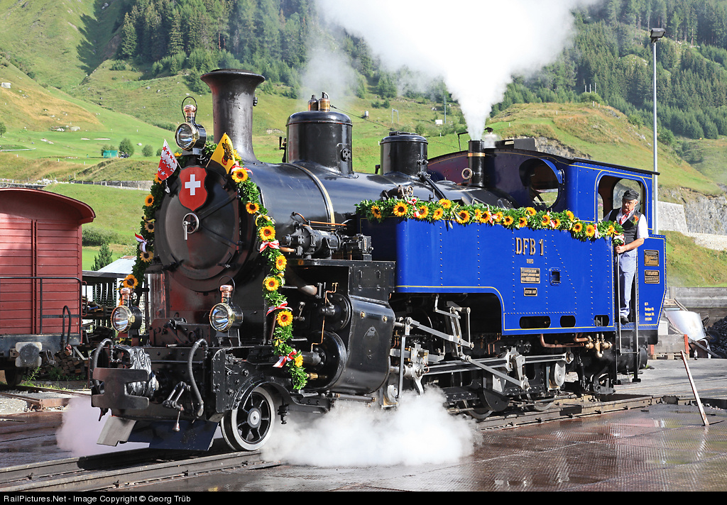 Beautifully decorated with sunflowers, the blazon of Switzerland and the flags of canton Uri ans Valais, steamlocomotive HG 3/4 1 of the Dampfbahn Furka Bergstrecke is ready to pull the inauguration train for the last leg Gletsch-Oberwald of the Furka mountain line.