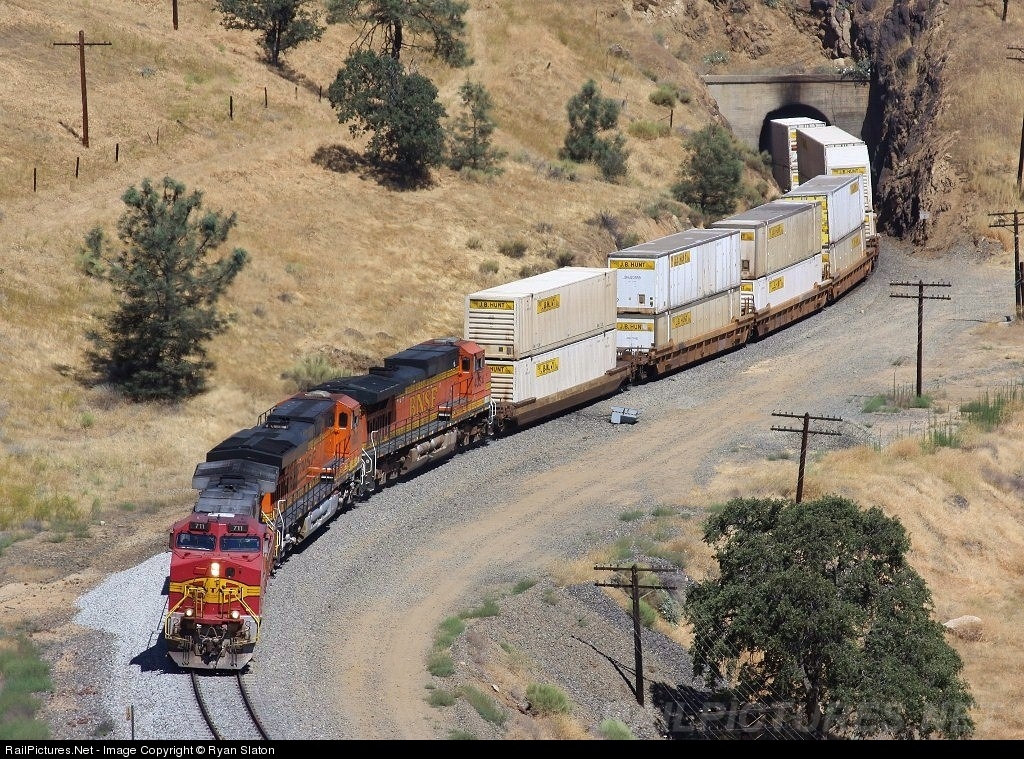 | After the westbounds pass at Bealville, BNSF 711 is given the all clear to head up the hill, & is seen emerging from Tunnel 10. |
