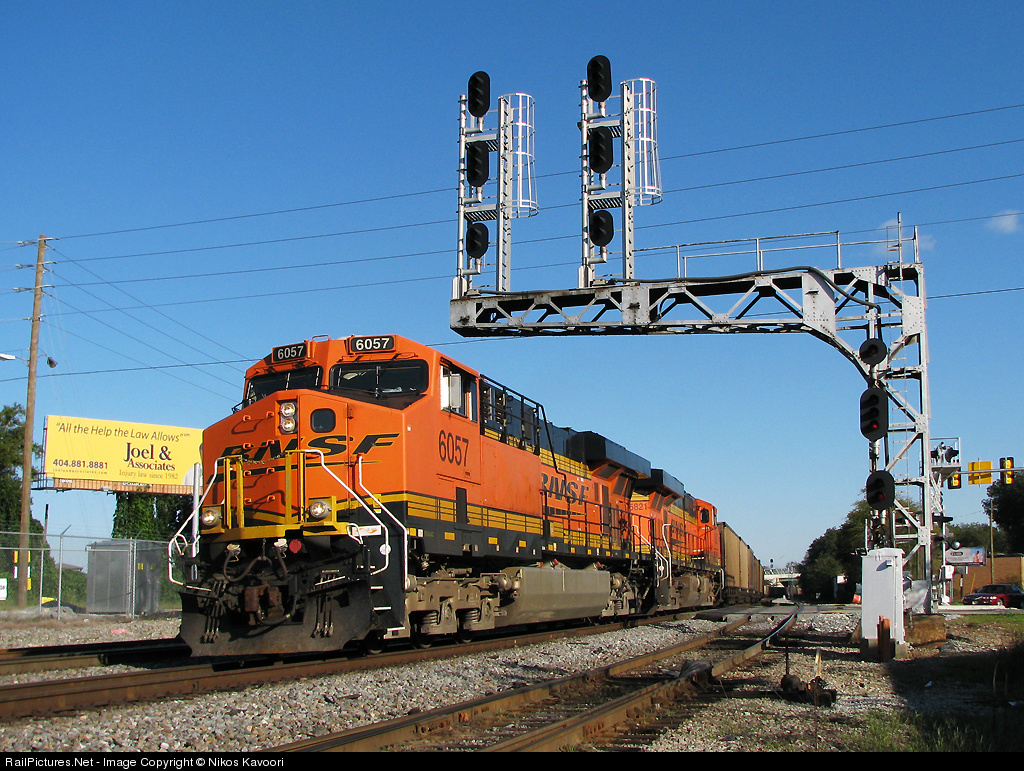 | A pair of BNSF GEVO's lead a empty Scherer coal train under the classic Southern signals at CP Henderson on the NS Atlanta South District. The signals have been modified with the new safety cages but thankfully the old bridge remains. |