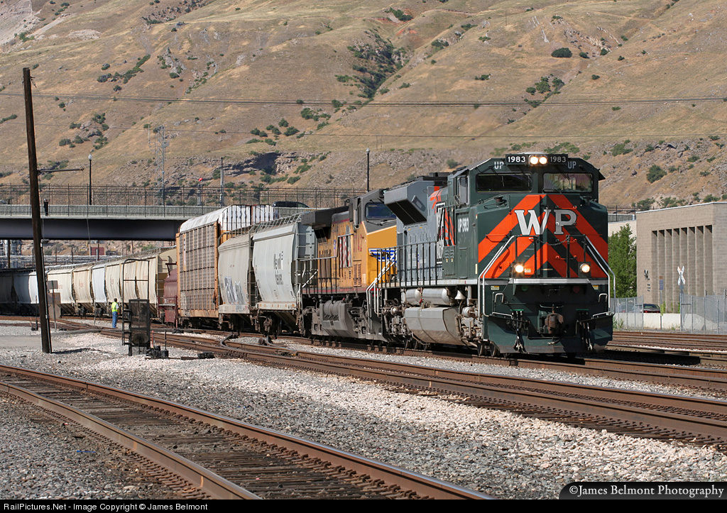 | Orange, green and silver paint lead Union Pacific's North Platte to West Colton manifest, making a pick up at North Yard in downtown Salt Lake City. |