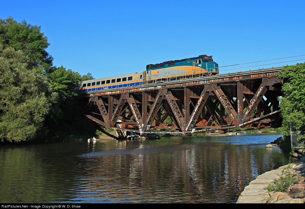 The swans don't care that VIA 90 passing overhead on the Credit River Bridge is led by one of the new F40 rebuilds, en route from Niagara Falls to Toronto.