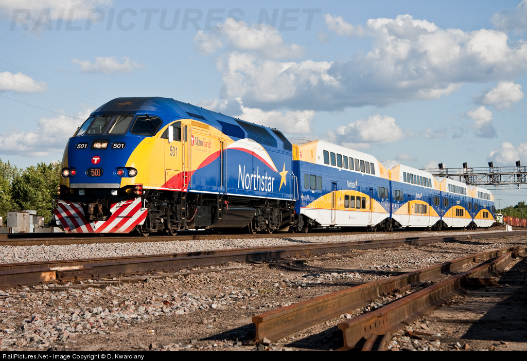 Northstar has one of the best looking paint schemes around and sure looks good in late evening sun. The last commuter of the day is seen heading through University on its way to Big Lake. MNRX 501 is the only unit out of the five to have stripes covering the entire plow.